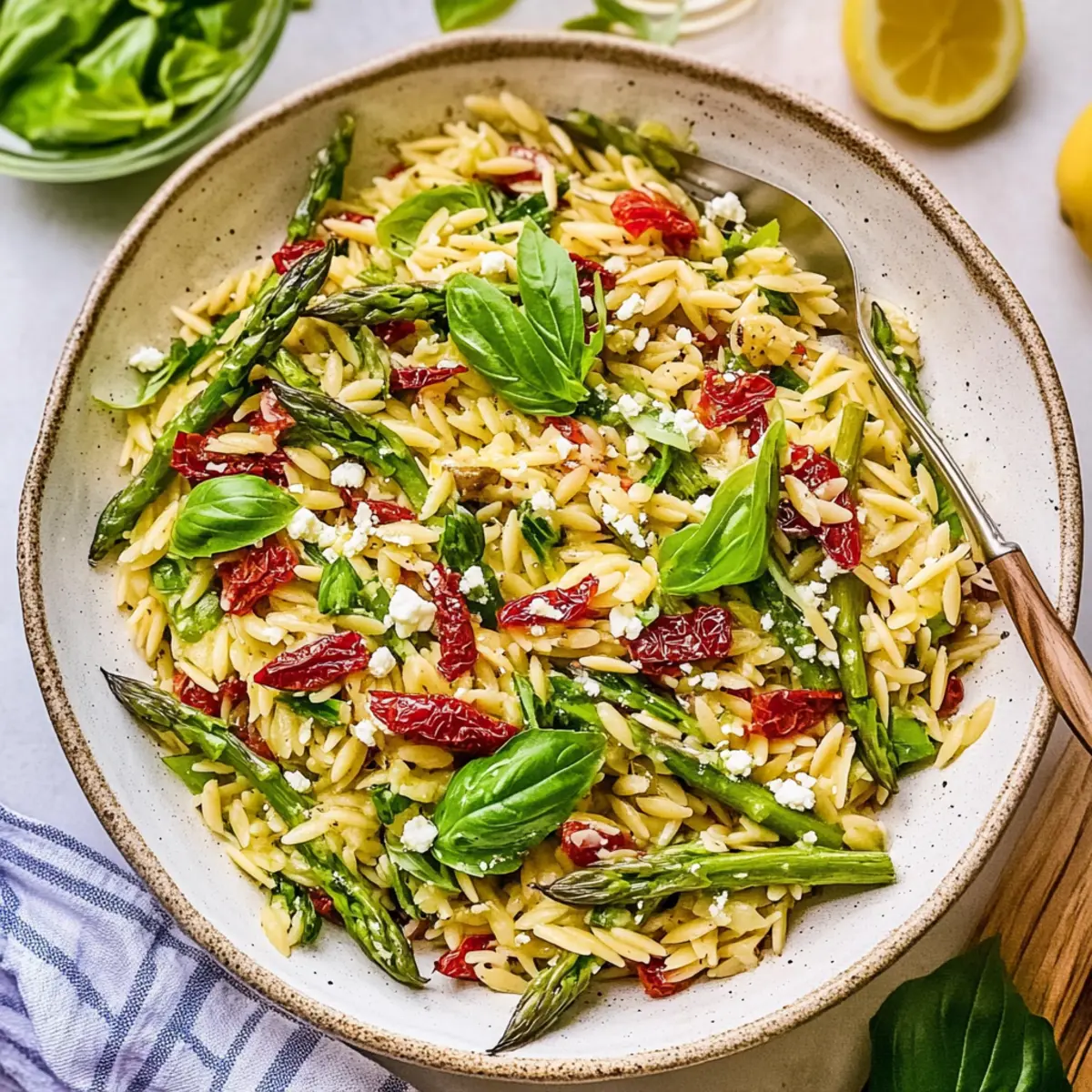 - In a large mixing bowl, combine the cooked orzo, sautéed asparagus, sun-dried tomatoes, red onion, and basil. Crumble in feta cheese and gently fold the salad together.