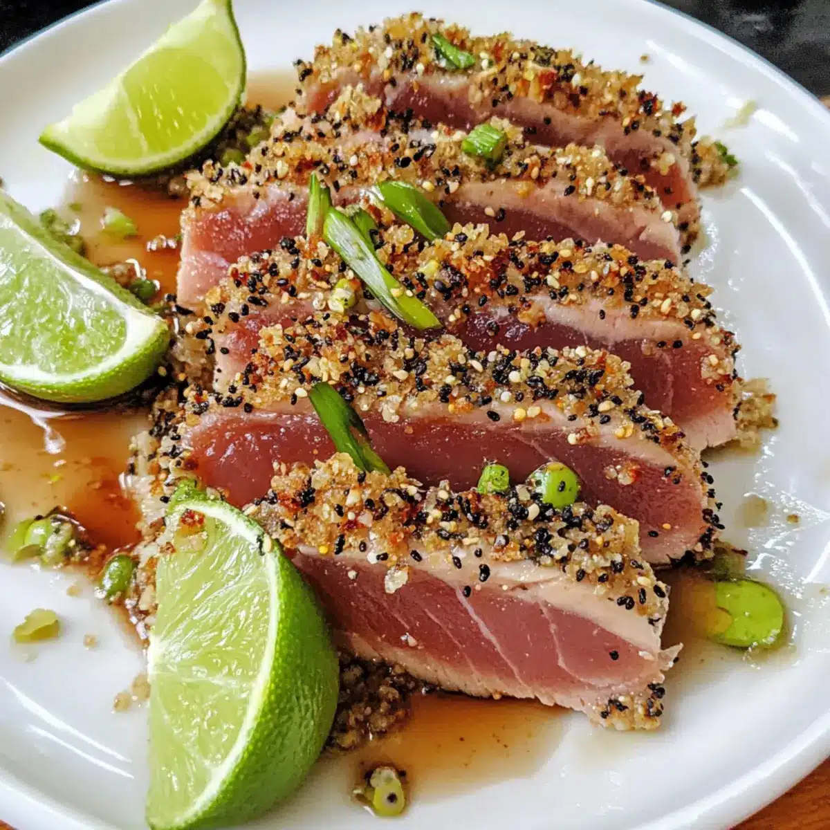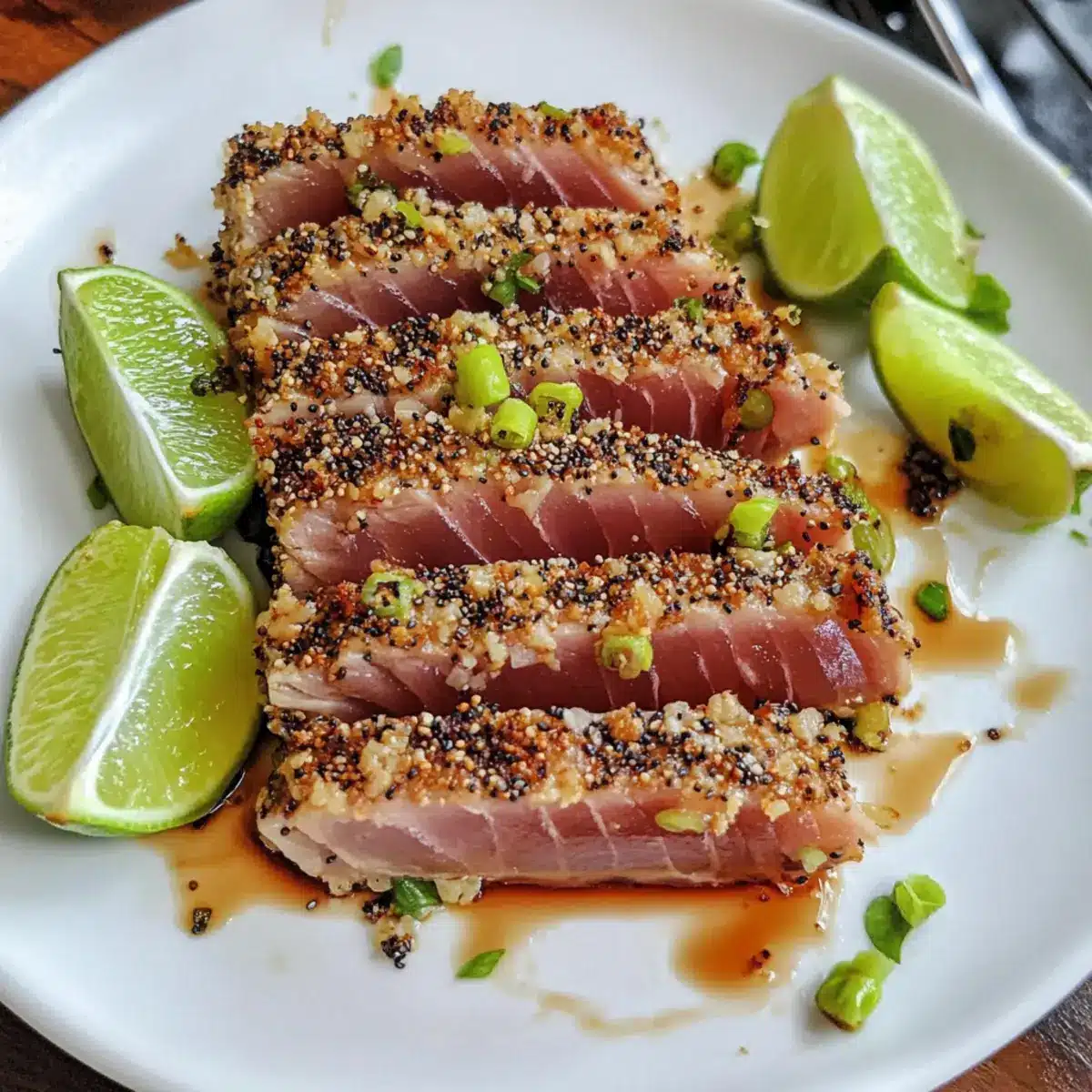 Slice the rested tuna into ¼-inch pieces, arranging them on a serving platter. Garnish with fresh lime zest and serve alongside lime wedges for an extra zesty kick. Drizzle with ponzu sauce for added flavor, and enjoy your stunning creation that’s sure to impress!