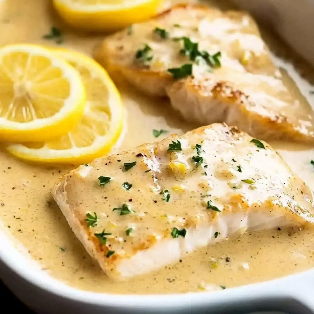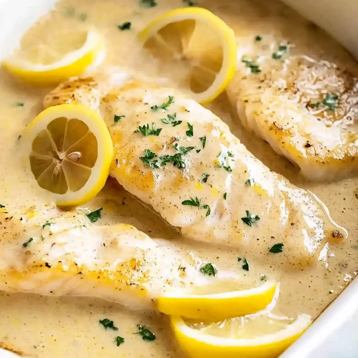 - Plate the fish with a spoonful of creamy lemon sauce on top. Garnish with fresh parsley and lemon slices.