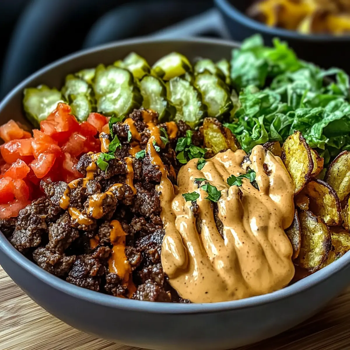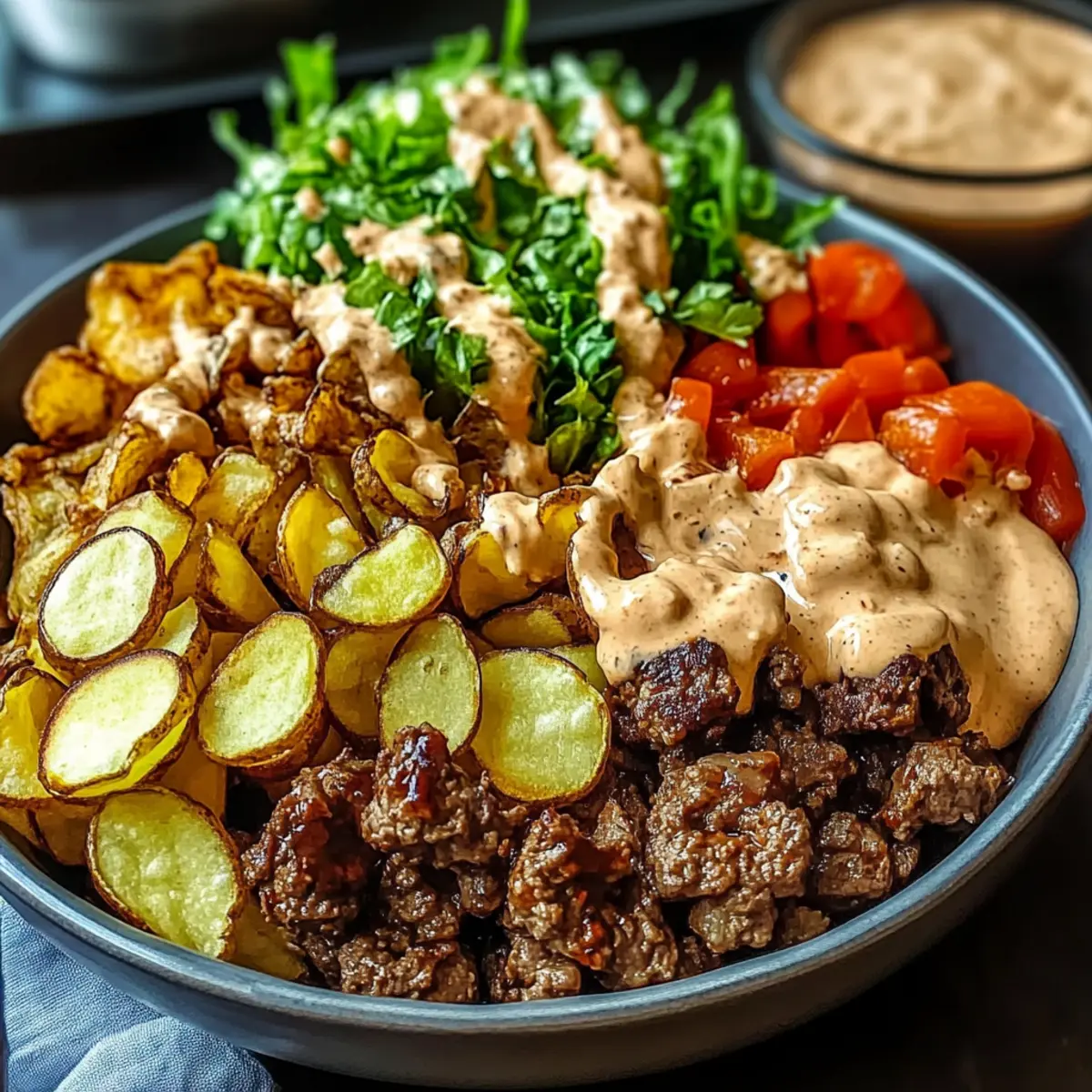 Now it’s time to bring your bold burger bowls together! On each plate or bowl, layer a generous serving of crispy chips as the base. Next, add a hearty scoop of cooked beef, followed by a handful of shredded lettuce. Finish with a sprinkle of cheese and drizzle generously with your homemade burger sauce for a flavor-packed meal. Serve immediately and savor every bite!