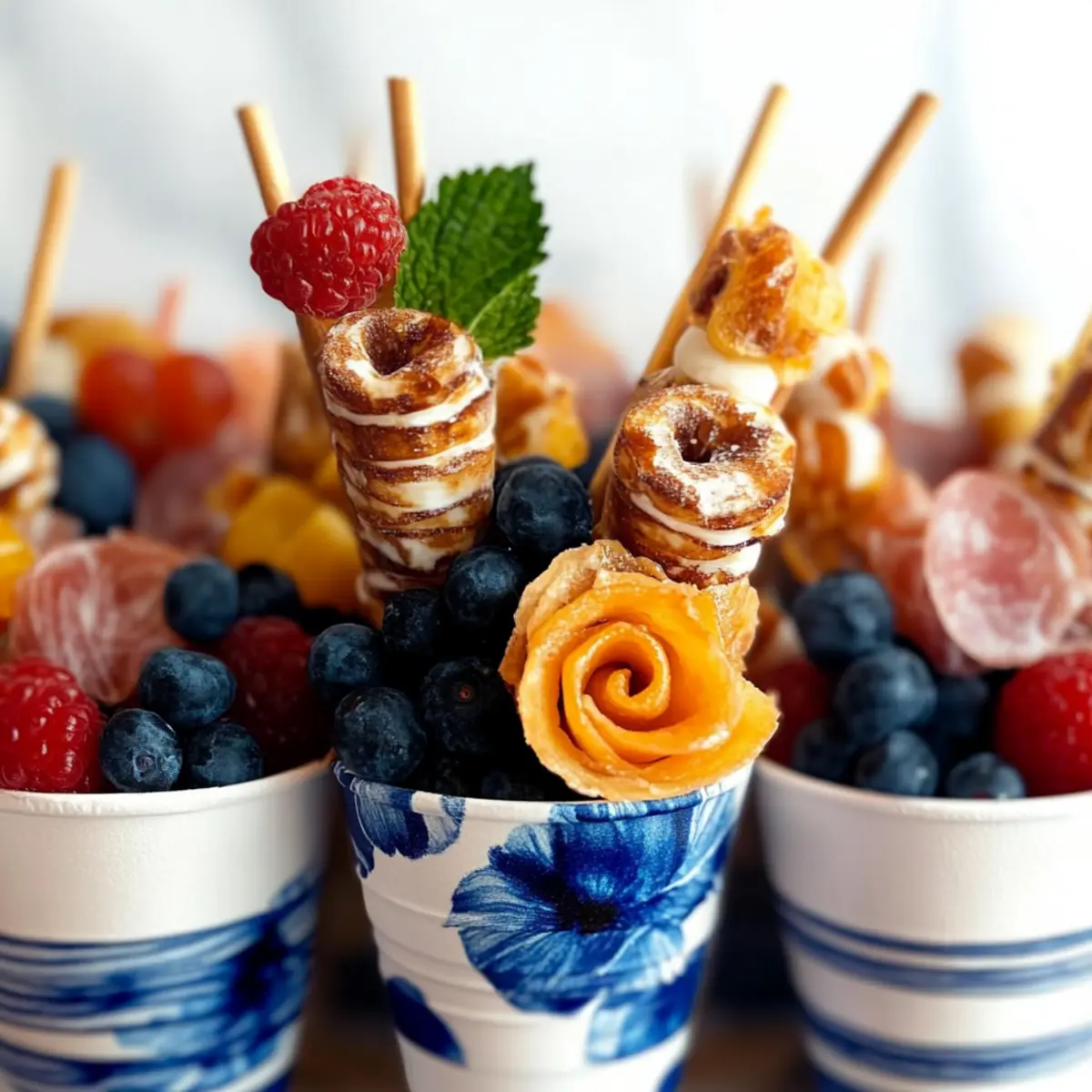 Now, it’s time to artfully arrange your prepared ingredients in each cup. Place the prosciutto-cantaloup skewers upright in the cups, allowing them to be the centerpiece. Surround these skewers with mini cinnamon rolls, donut holes, and scattered fresh berries. This colorful display not only looks fantastic but also gives guests a variety of options to enjoy.
