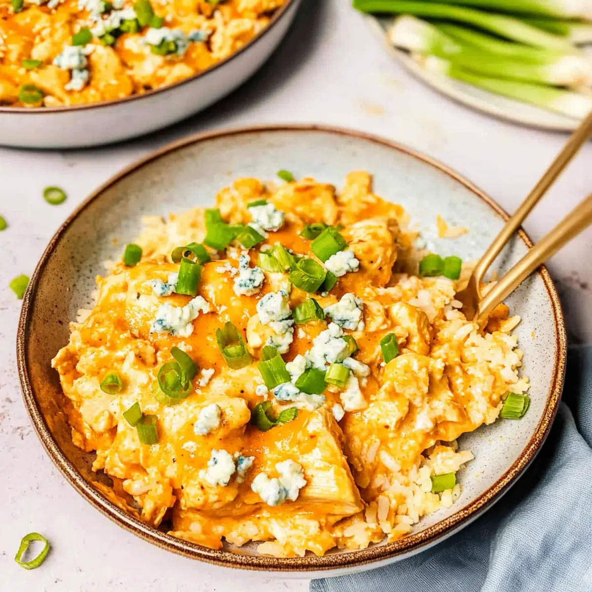 - Spoon the Buffalo Chicken Casserole into bowls and serve hot, garnished with extra green onions if desired.