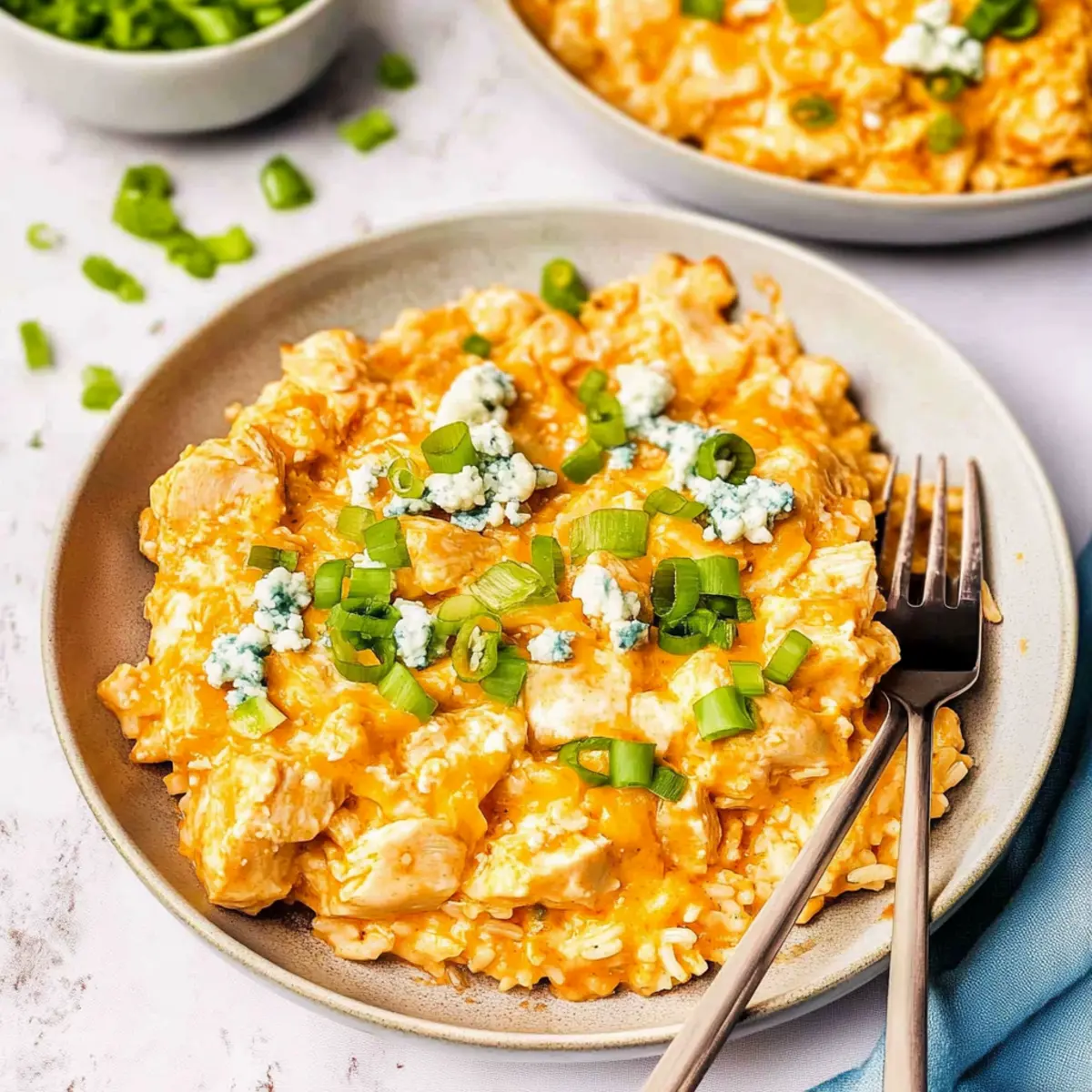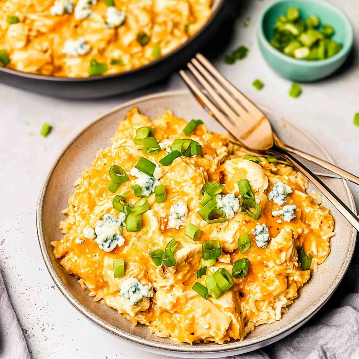 Remove the skillet from heat and fluff the rice with a fork for a light texture. Stir in 1 cup of shredded cheddar cheese and ½ cup of crumbled blue cheese, mixing until melted and creamy. Lastly, fold in chopped green onions for a fresh finish. This Buffalo Chicken Casserole is now ready to be served!