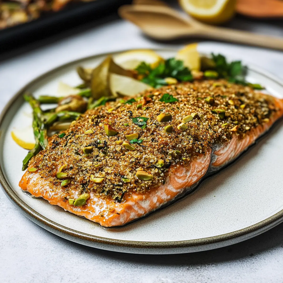No worries! If the crust is sliding off the salmon, ensure you’re using enough of the binding sauce (mayo, honey, and Dijon) when coating the fillets. A thicker layer will help the pistachio-panko mixture adhere better. Additionally, pressing down gently as you coat can help lock in that glorious crust!