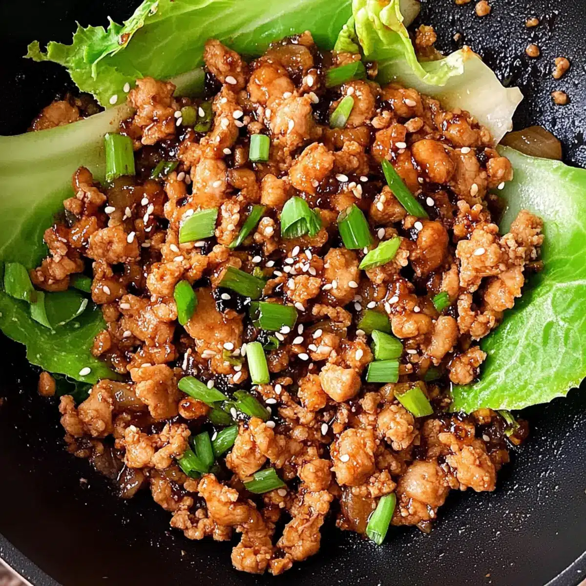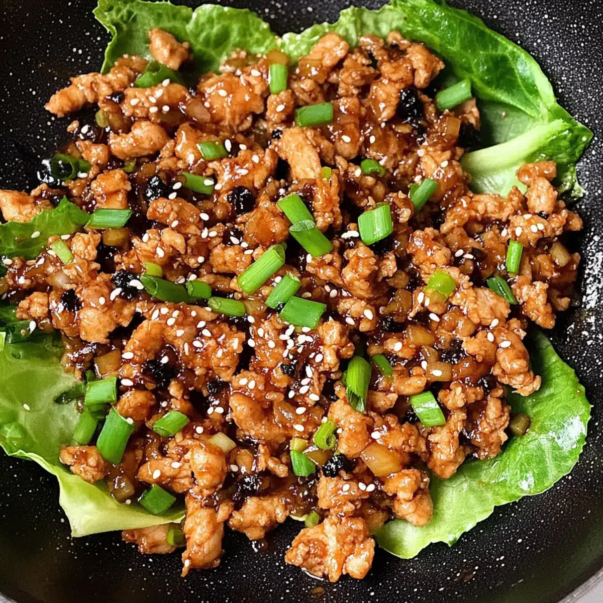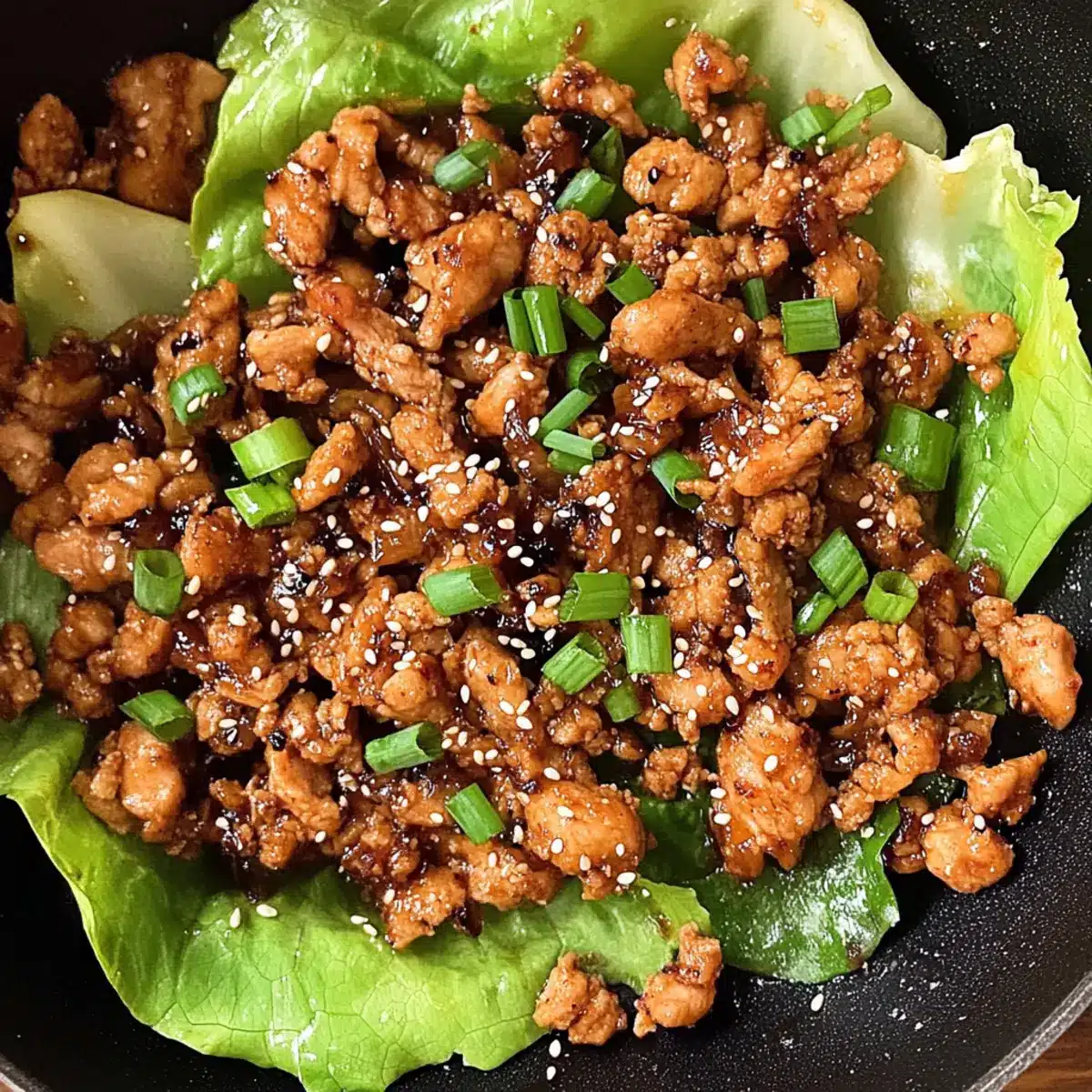 Stir in a tablespoon of toasted sesame seeds and finely chopped green onions, then remove the skillet from the heat. These finishing touches add a delightful crunch and layer of flavor to your Chicken Lettuce Wraps, ensuring a satisfying bite.