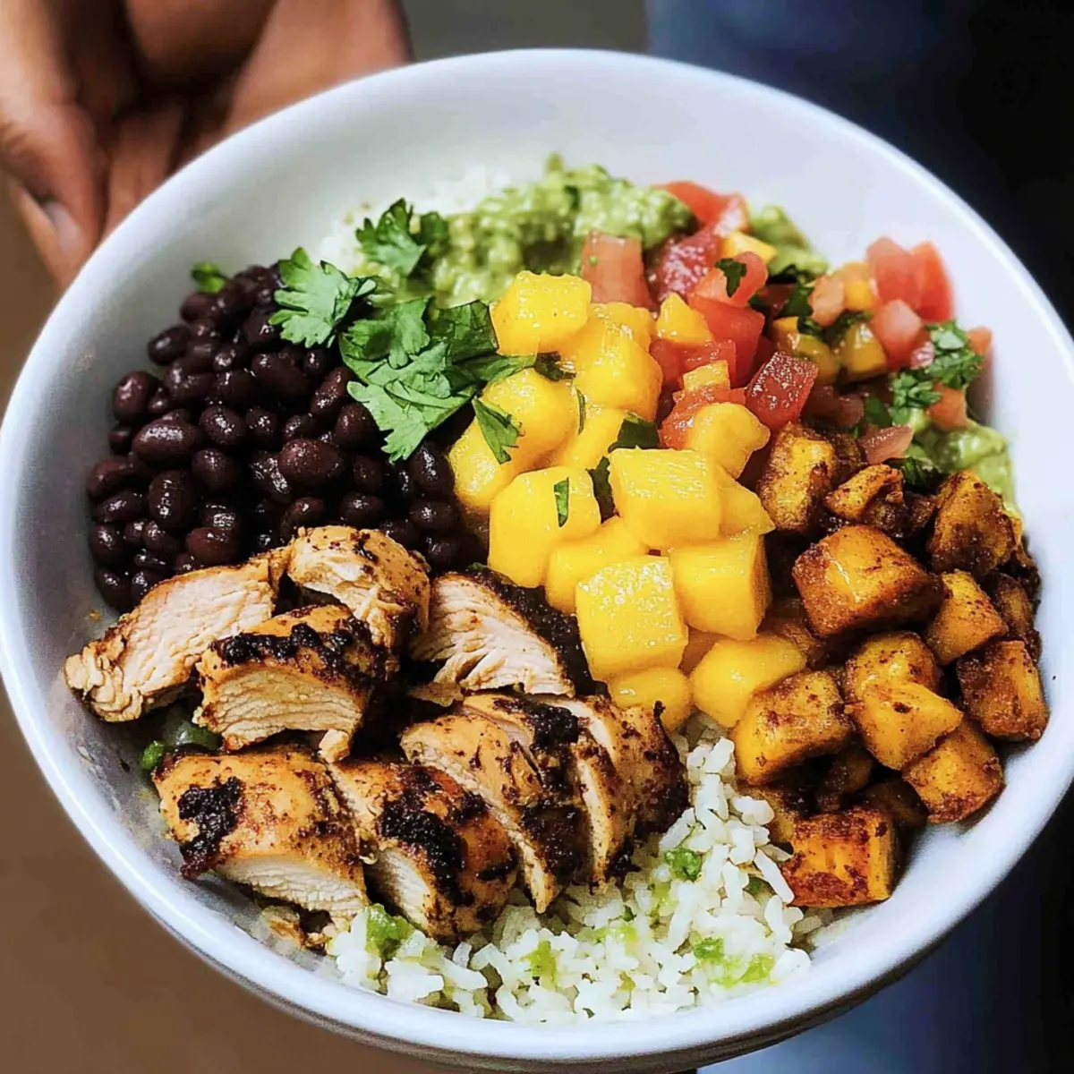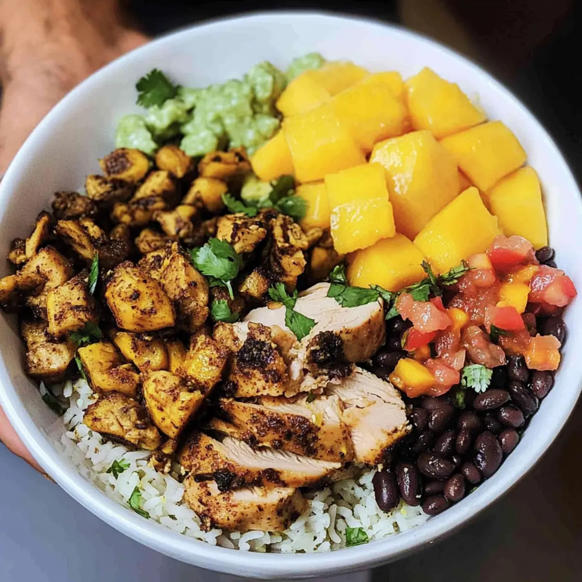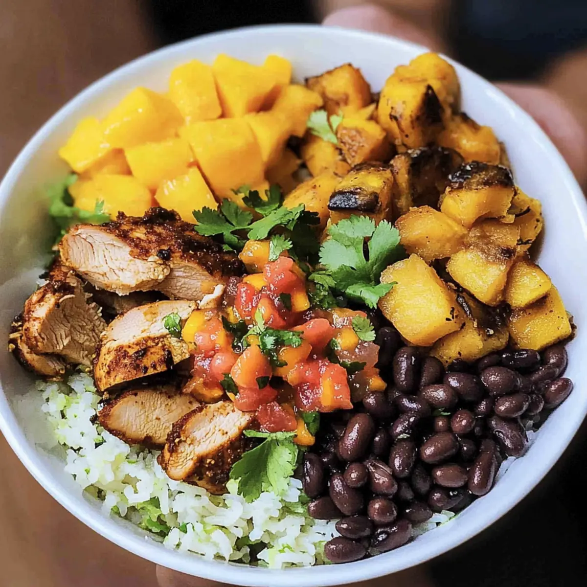 - Assemble the bowls starting with rice, followed by black beans, sliced chicken, and top with mango salsa.