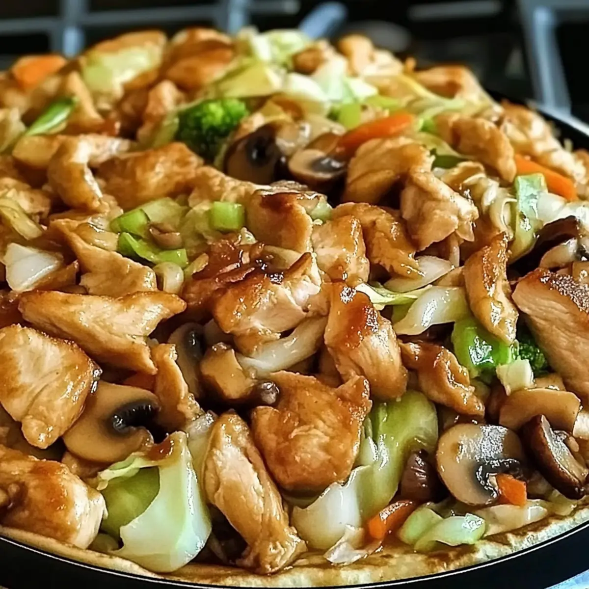 Next, introduce shredded cabbage, carrots, and sliced mushrooms to the skillet. Stir-fry these vegetables for 2 to 3 minutes until they are tender yet still crisp, retaining their vibrant color and crunch. This step helps build layers of flavor and texture in your Easy Moo Shu Chicken.