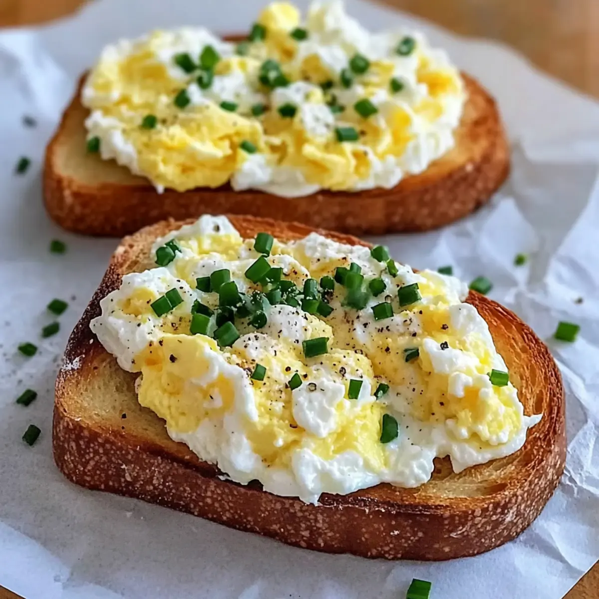 - Spoon the creamy egg and ricotta mixture over the toasted bread and serve warm, garnished with extra chives or salt.
