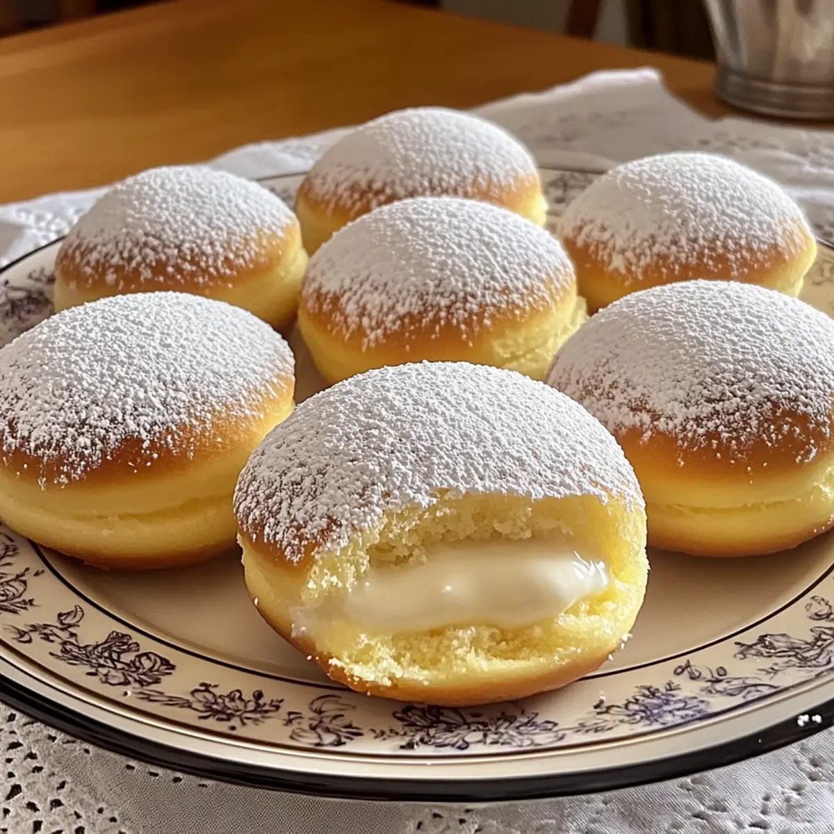 - Fill piping bag with custard, poke a hole in each doughnut, and fill. Dust with powdered sugar and serve warm.