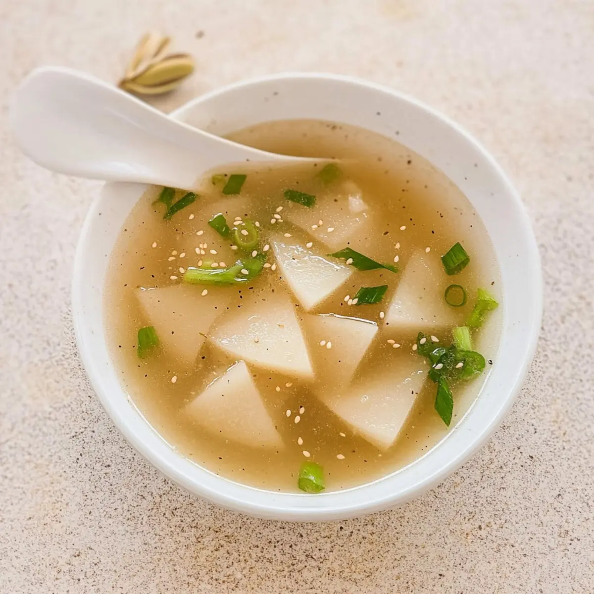 Ladle the hot soup into bowls and finish with a sprinkle of sesame seeds, a dash of white pepper, and extra green onions for garnish. This final touch not only enhances the presentation but also adds a delightful crunch. Enjoy your comforting Vegan Korean Radish Soup with a side of steamed rice or kimchi!
