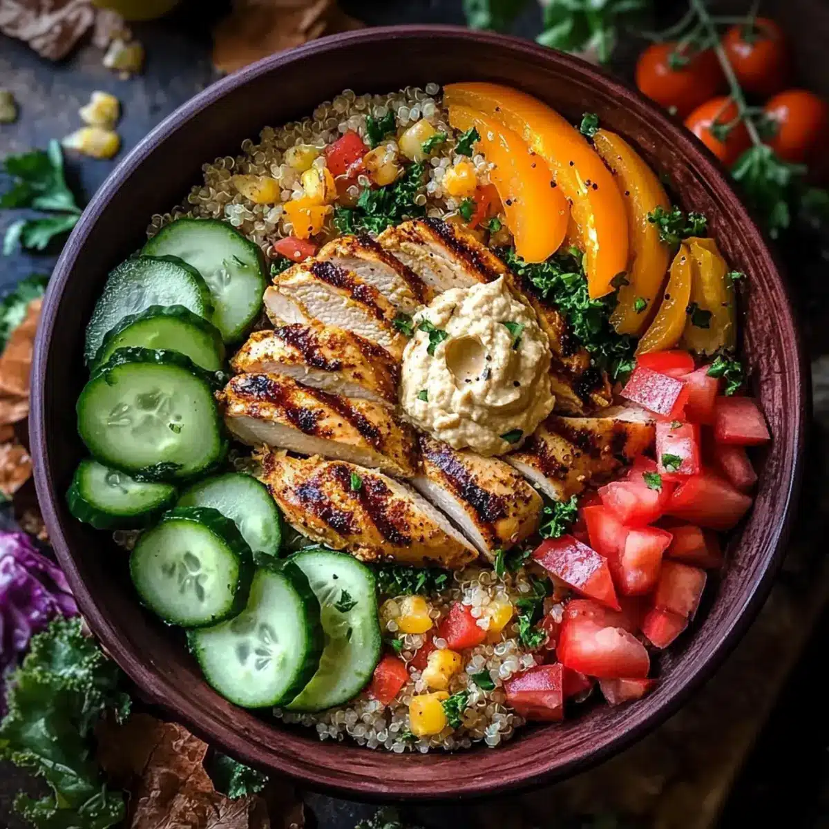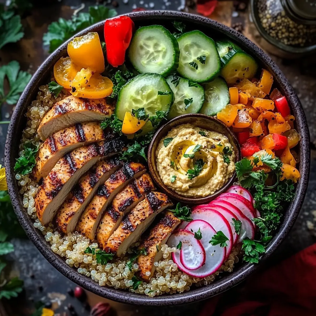 - In each bowl, layer fluffy quinoa as the base, top with sliced chicken, and diced vegetables, and finish with a dollop of hummus.