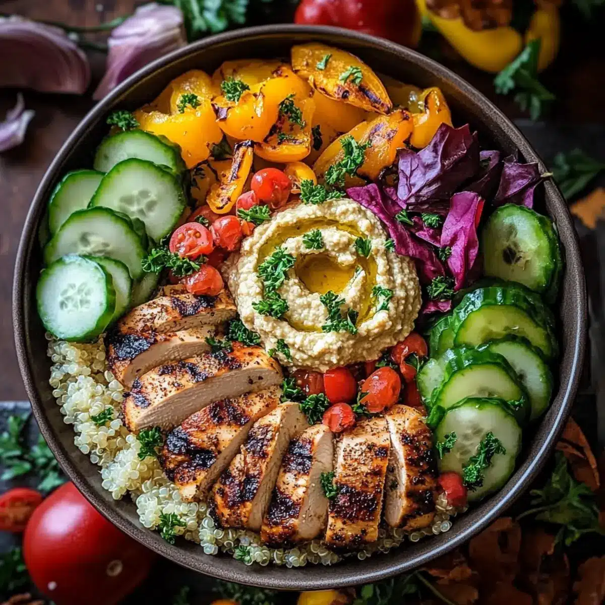 In each serving bowl, start by layering a generous scoop of the fluffy quinoa as the base. Next, add the grilled chicken, sliced neatly on top. Follow with the diced vegetables to create a vibrant, inviting presentation. Finish with a dollop of creamy hummus in each bowl, ensuring every bite is packed with flavor.