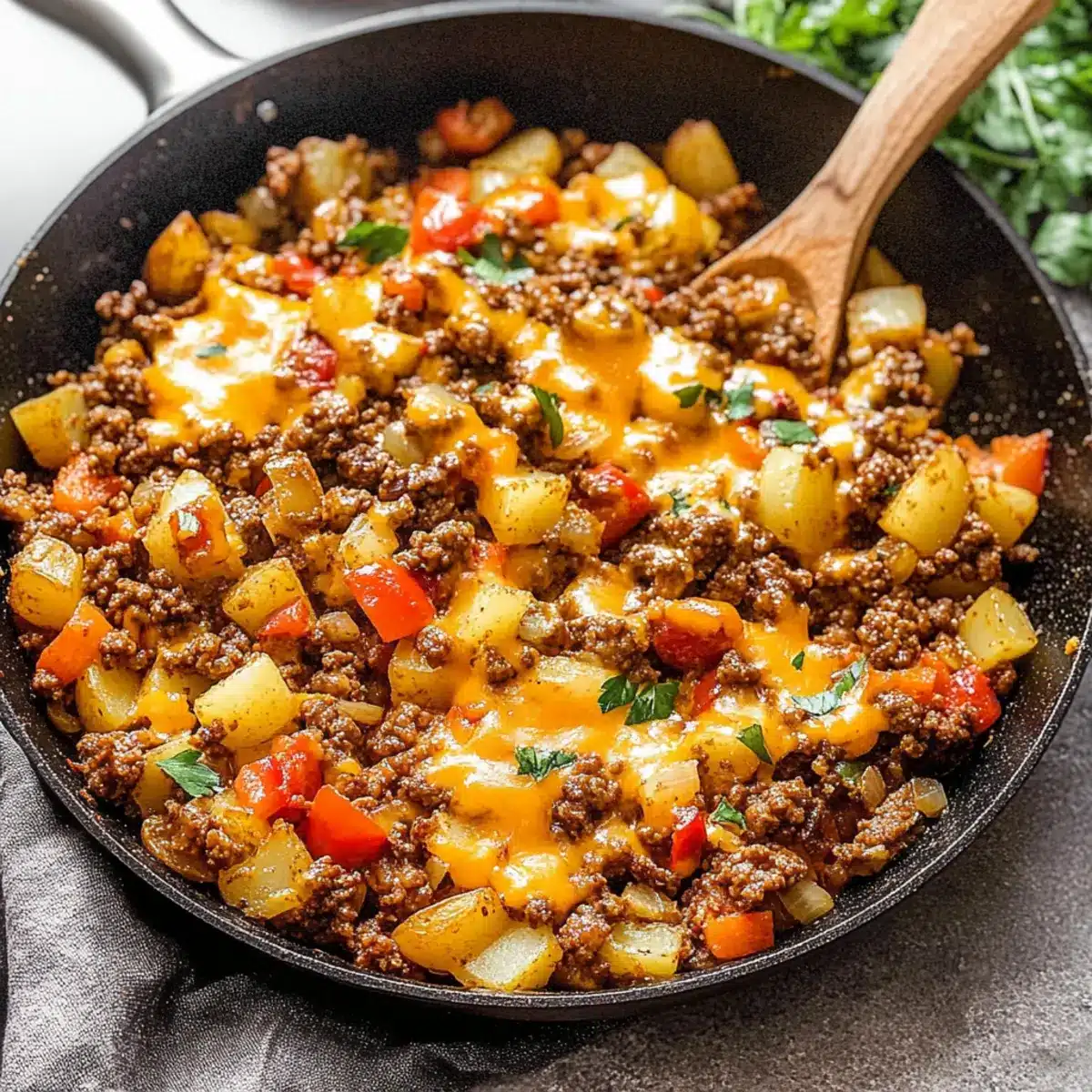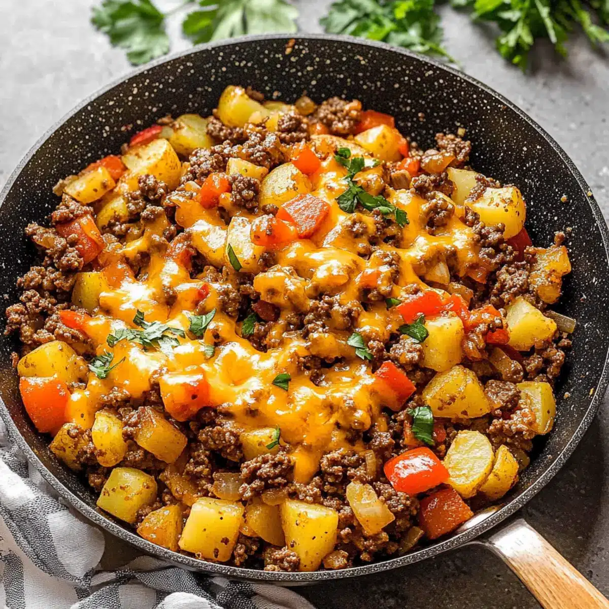 These Cheesy Ground Beef and Potato Skillet preparations are perfect for busy weeknights! You can chop your vegetables (onions, bell peppers) and dice the potatoes up to 24 hours in advance, storing them in an airtight container in the refrigerator. Additionally, you can brown the ground beef ahead of time, allowing it to cool before refrigerating for up to 3 days. When you’re ready to serve, simply heat everything in the skillet, follow the remaining steps for adding the spices and cheese, and you’ll have a delicious, comforting meal in no time! This way, you can reap the rewards of a homemade dinner without the extensive prep work during a busy evening.