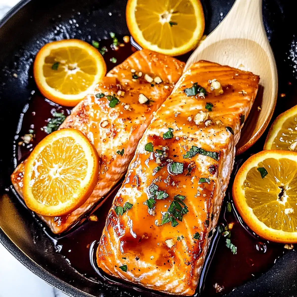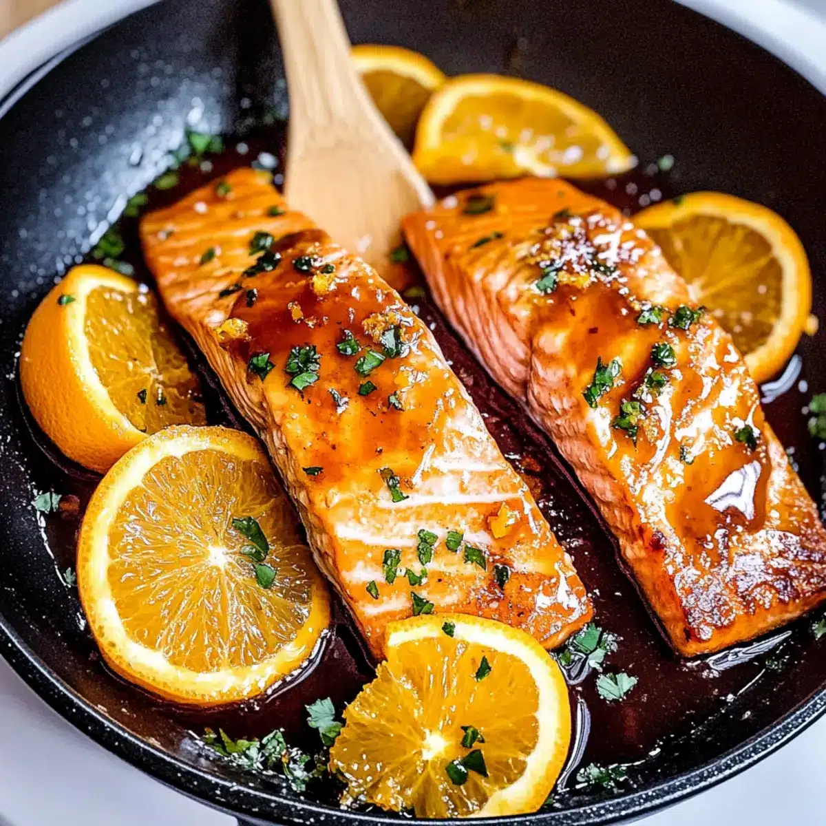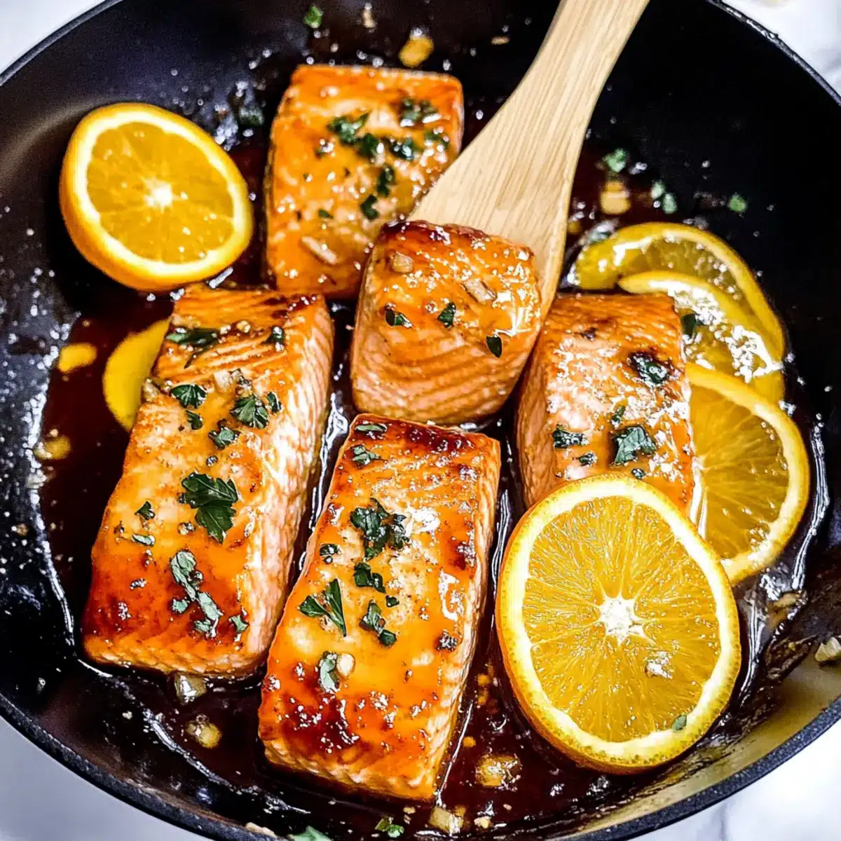 - Transfer the Orange Glazed Salmon to serving plates, drizzling any remaining glaze from the skillet over each fillet.