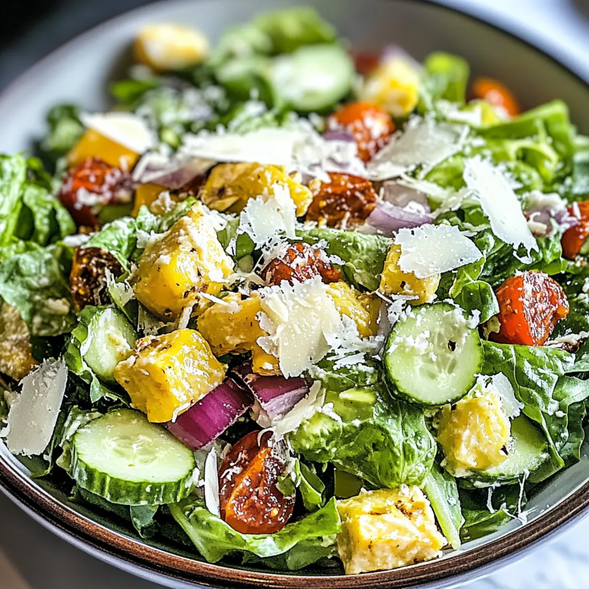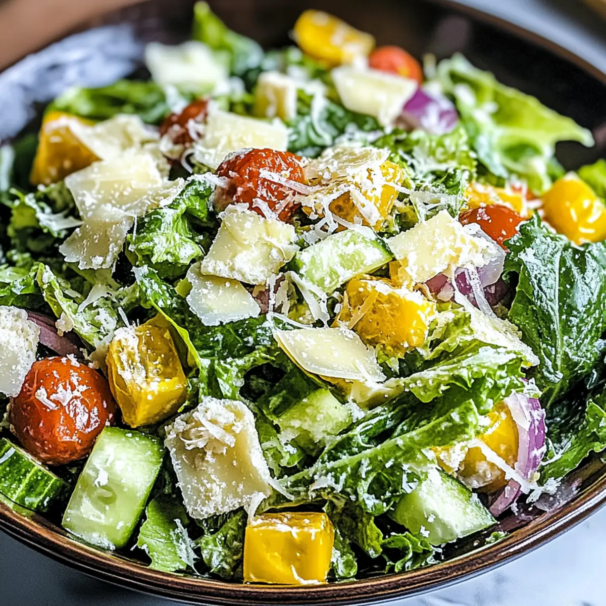 These Parmesan Chopped Salad preparations are perfect for busy weeknights! You can wash and chop the romaine lettuce, cucumber, tomatoes, red onion, and bell pepper up to 3 days in advance; just store them in an airtight container in the refrigerator to keep them crisp. The vinaigrette can also be made ahead and stored for up to 1 week; simply whisk together the olive oil, red wine vinegar, Dijon mustard, minced garlic, salt, and pepper, and keep it in the fridge. To enjoy the salad at its best, mix the prepped vegetables and pour the dressing over just before serving, ensuring a fresh, vibrant taste without losing any of that delightful crunch!