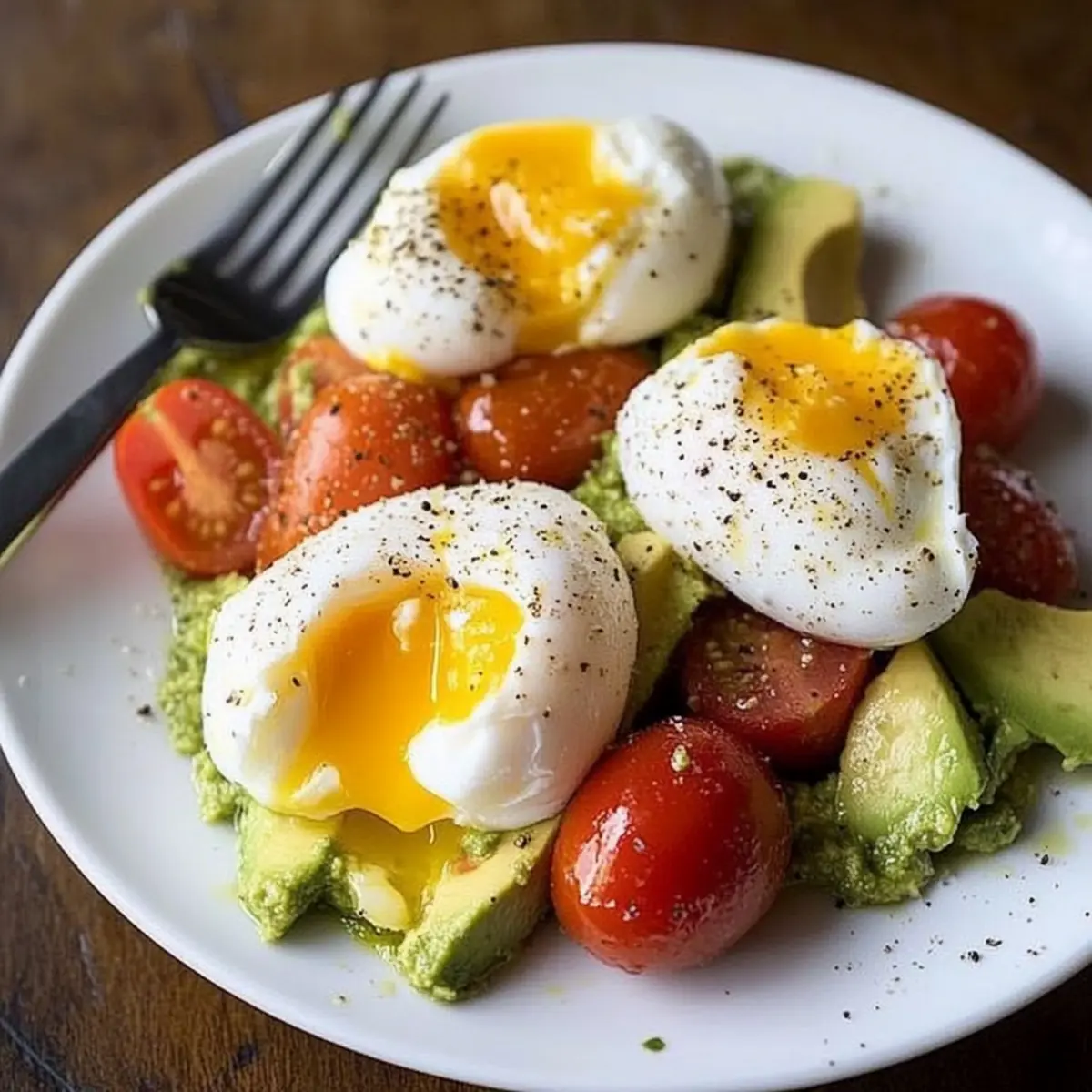 - On plates, divide avocado and tomato mixture to create a base. Place two poached eggs atop each portion.