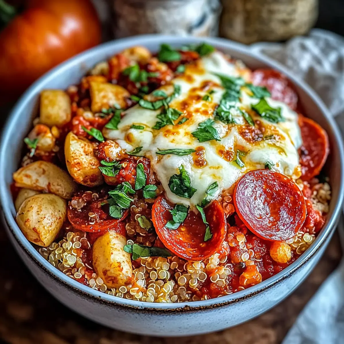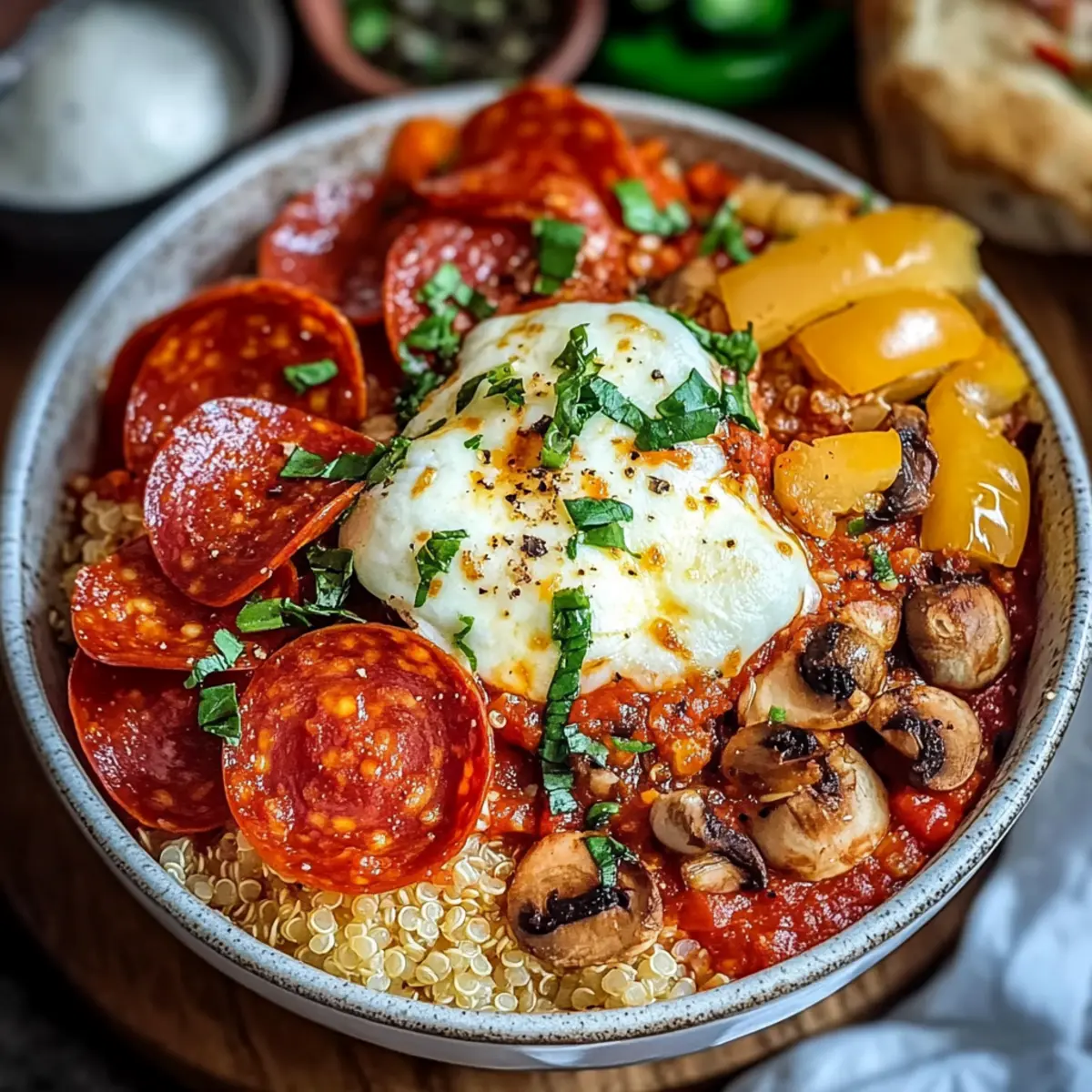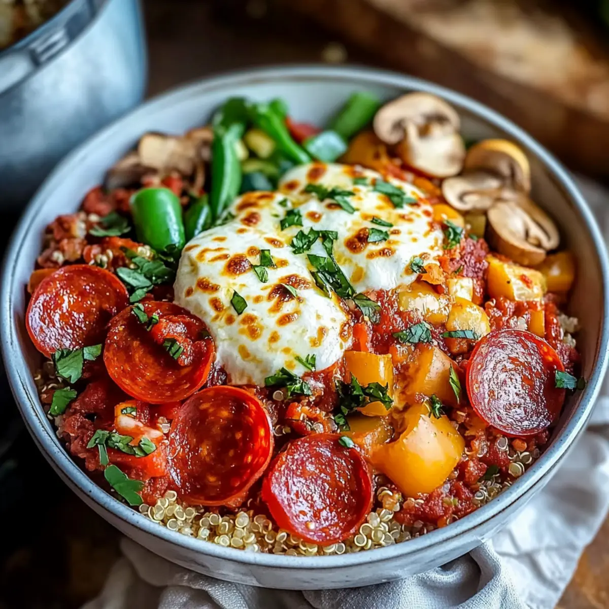 These Pizza Protein Bowls are perfect for busy weeknights, allowing you to savor the rich flavors of pizza with ease! You can prepare the quinoa and sauté the vegetables (bell peppers, mushrooms) up to 3 days in advance; simply refrigerate them in an airtight container. To maintain freshness and avoid sogginess, store the cheese and pepperoni separately. When you’re ready to enjoy your meal, just reheat the quinoa and veggies in a skillet, top with mozzarella and the desired toppings, then broil for 3-5 minutes until the cheese is melted and bubbly. This preparation ensures you have a delicious, hassle-free dinner waiting for you!