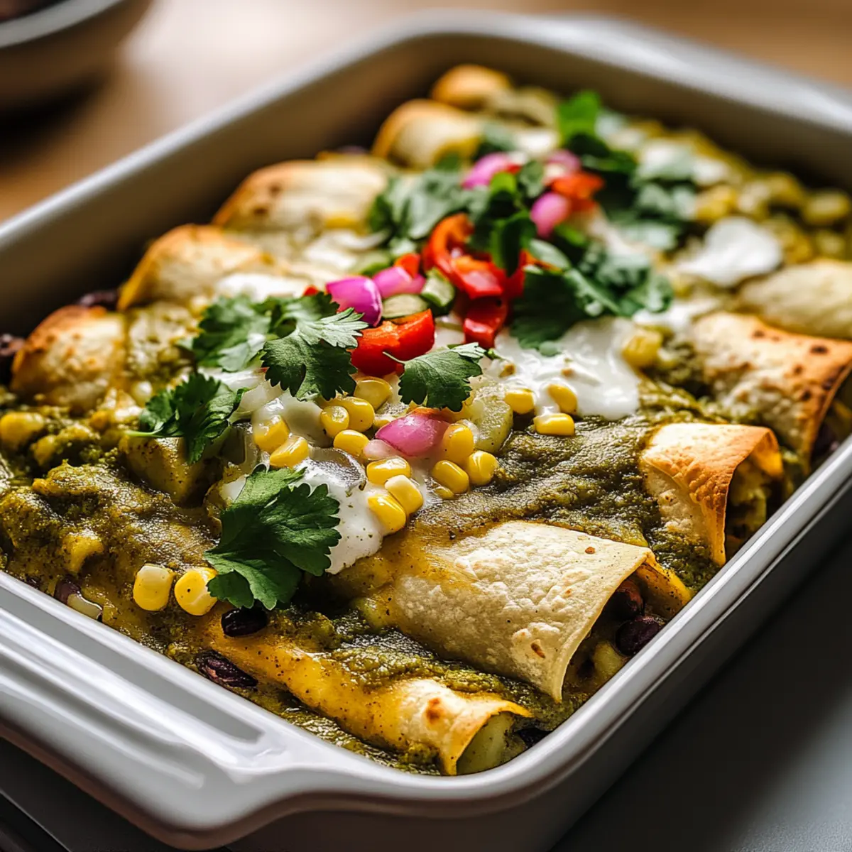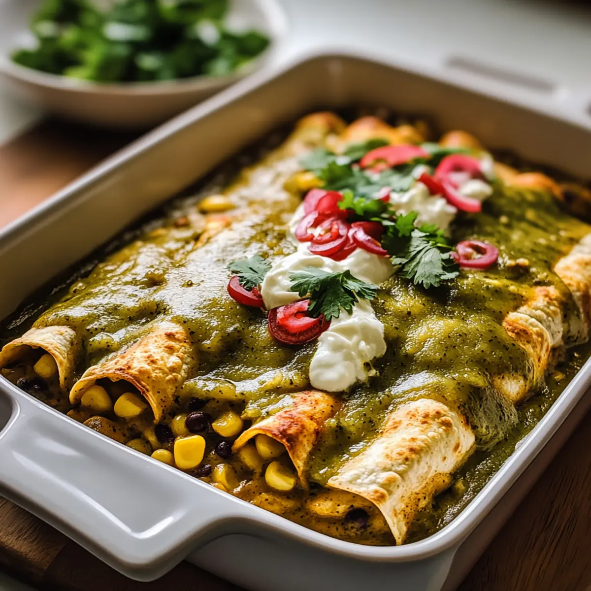 Once baked, remove the dish from the oven and allow the enchiladas to cool slightly for about 5 minutes. This resting time makes serving easier. Finally, garnish with fresh cilantro and slices of avocado, adding vibrant color and flavor to your comforting Potato Green Chili Enchiladas.