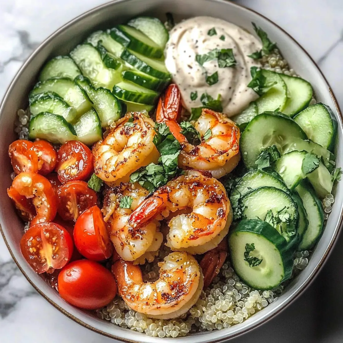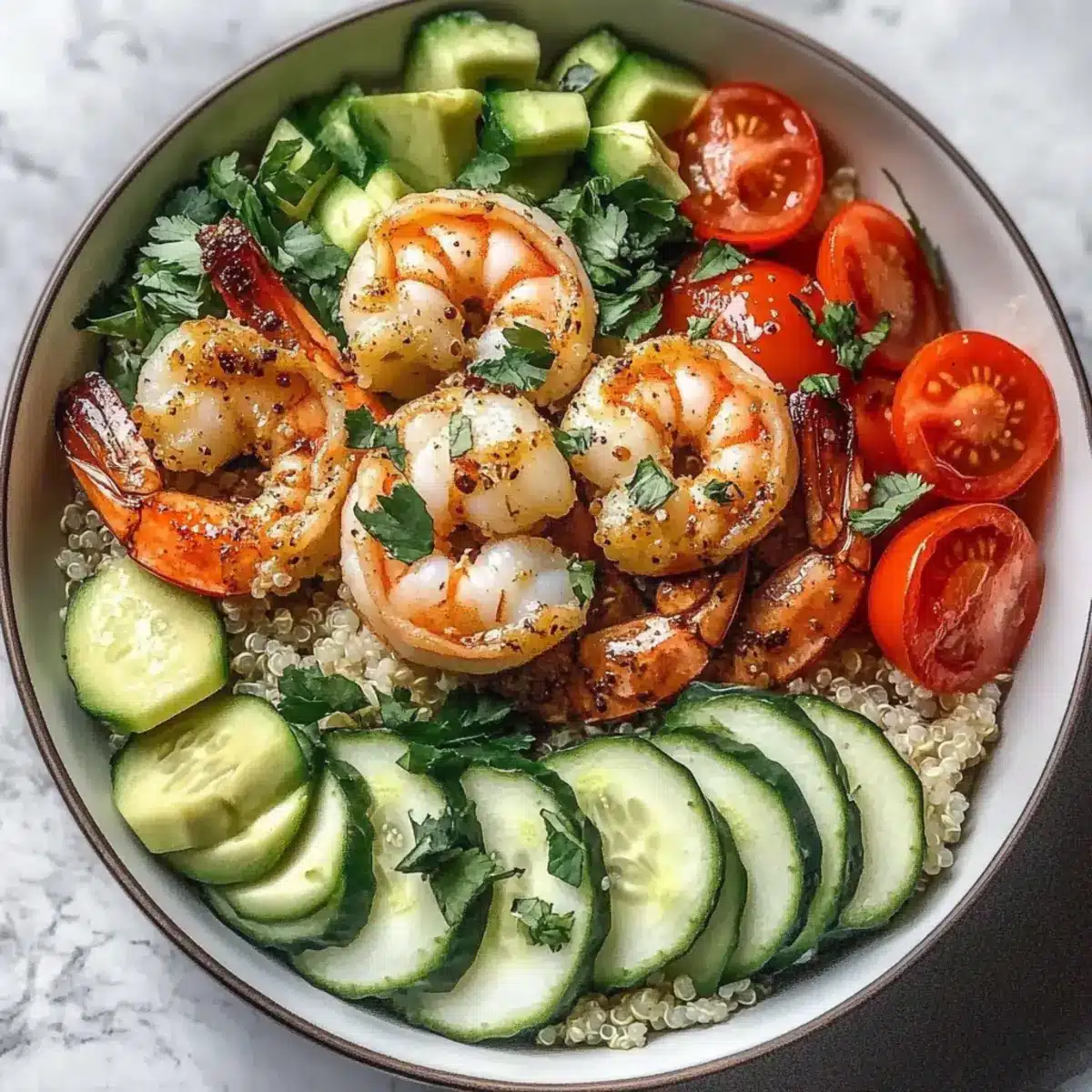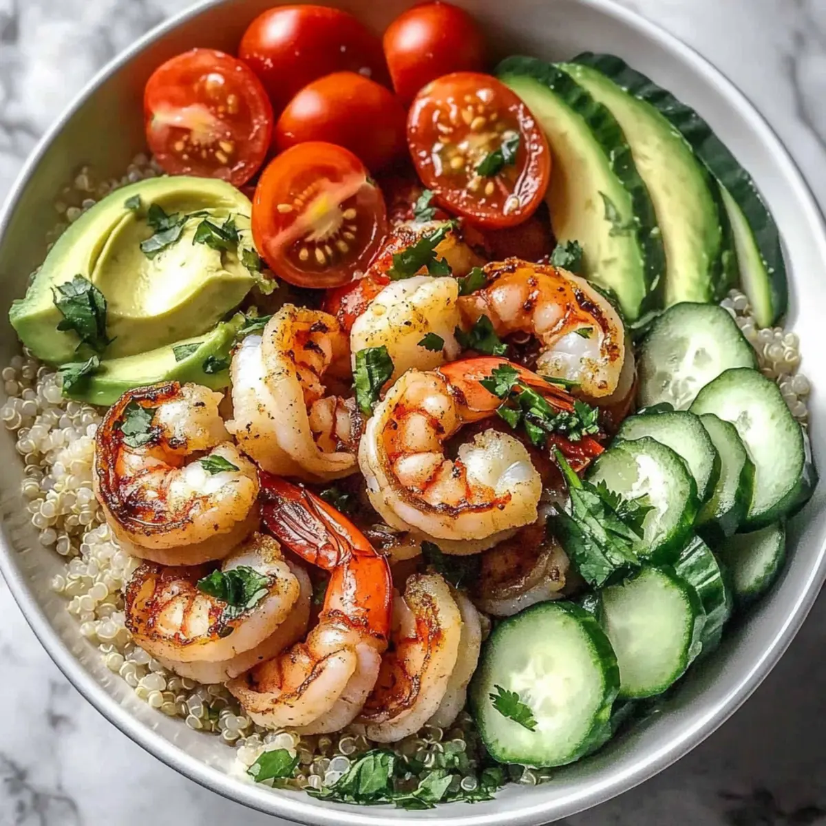 - Assemble the bowl starting with quinoa, layer in shrimp, and top with vegetables.