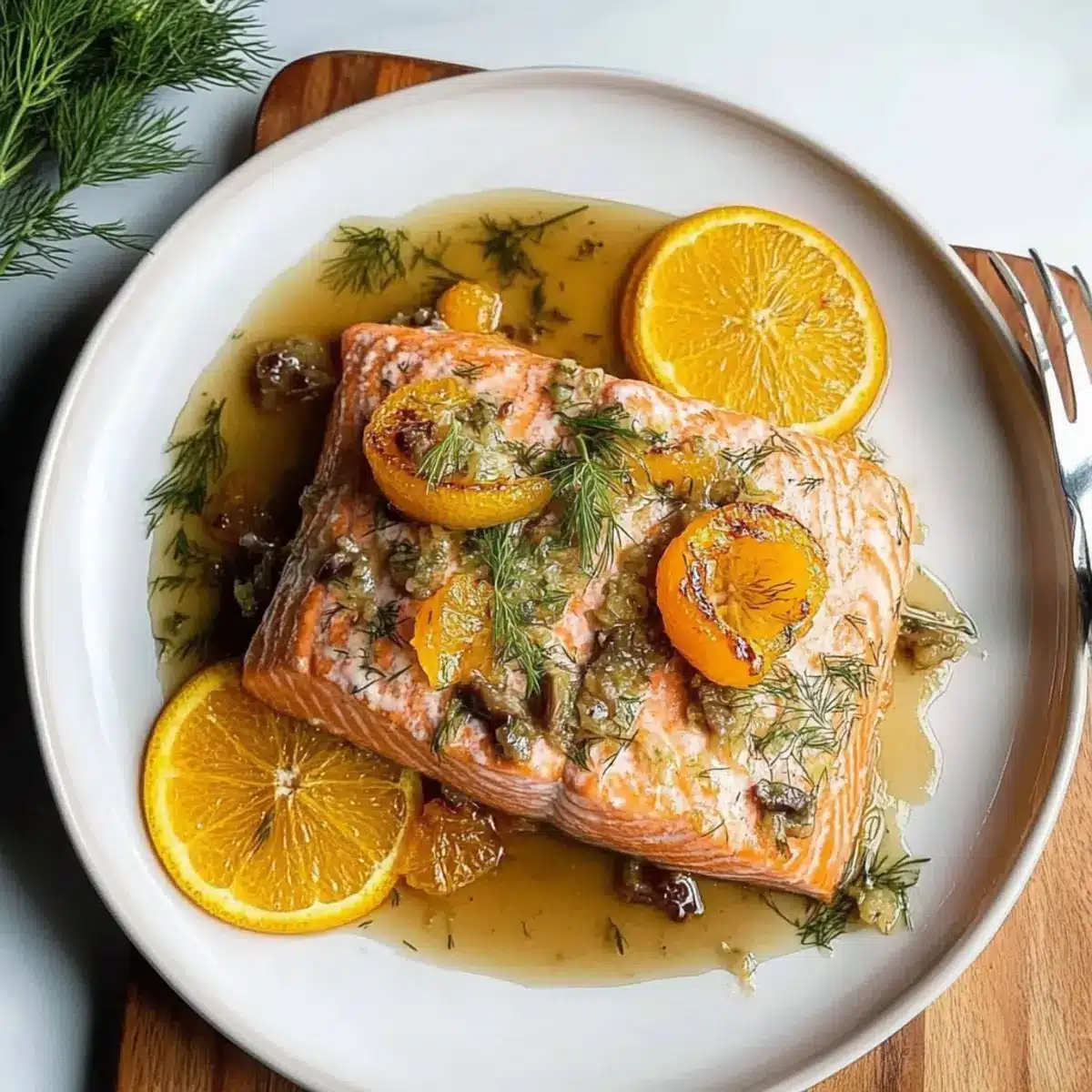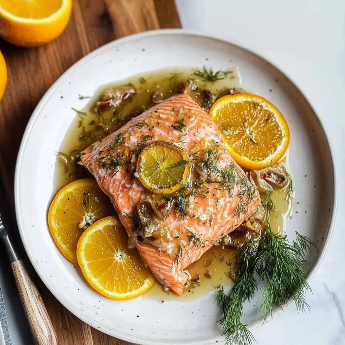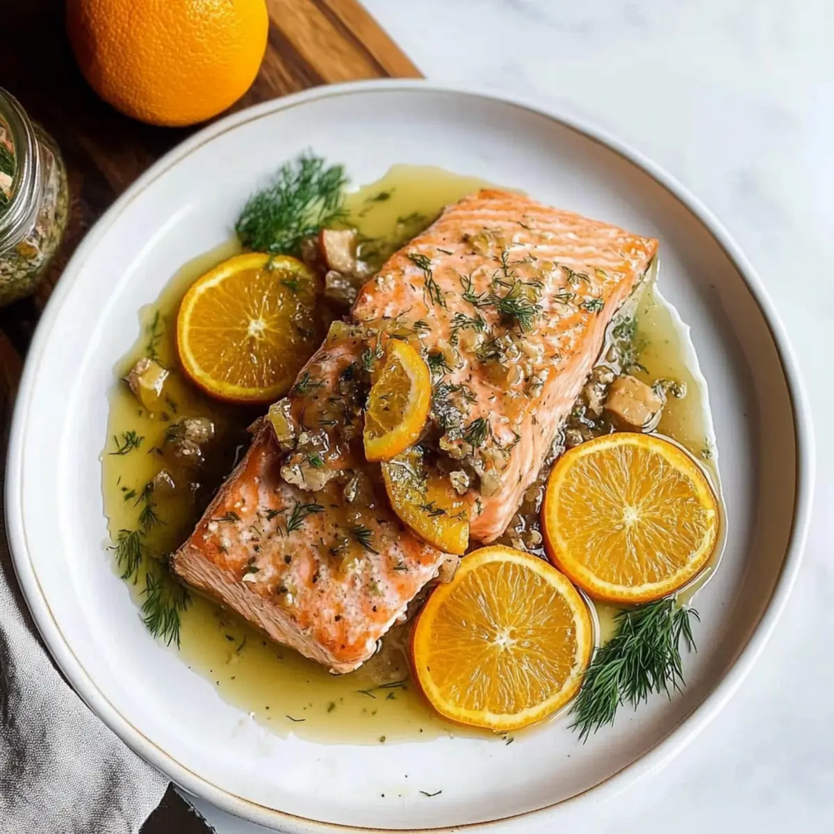 - Drizzle the reserved marinade over the cooked salmon and garnish with caramelized orange slices and dill.