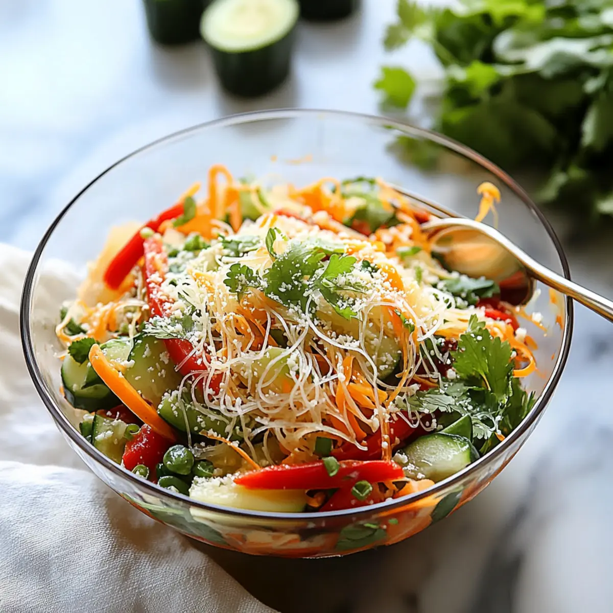 Absolutely! For the best flavor and crunch in your Spring Roll Salad, look for vibrant, firm vegetables. Carrots should be bright orange without dark spots, while bell peppers should feel heavy for their size and have no signs of wrinkling. Cucumbers should be firm, smooth, and shiny. Fresh herbs must be bright, fragrant, and free from wilting or brown edges.