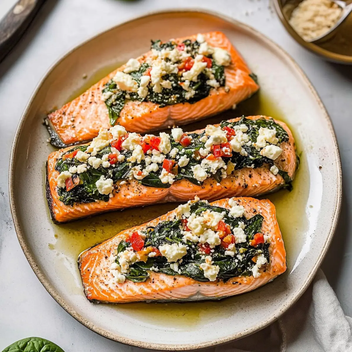 These Spinach & Feta Stuffed Salmon fillets are perfect for meal prep enthusiasts! You can prepare the filling up to 3 days in advance by sautéing the spinach and mixing it with the feta, roasted red peppers, and spices; simply refrigerate it in an airtight container. When you’re ready to cook, simply slice your salmon fillets, stuff them with the filling, and bake. This method not only saves time but ensures your dinner is just as delicious as if you had made it on the spot. Just remember to check for doneness after 12-17 minutes in the oven, and enjoy a quality meal without the last-minute rush!