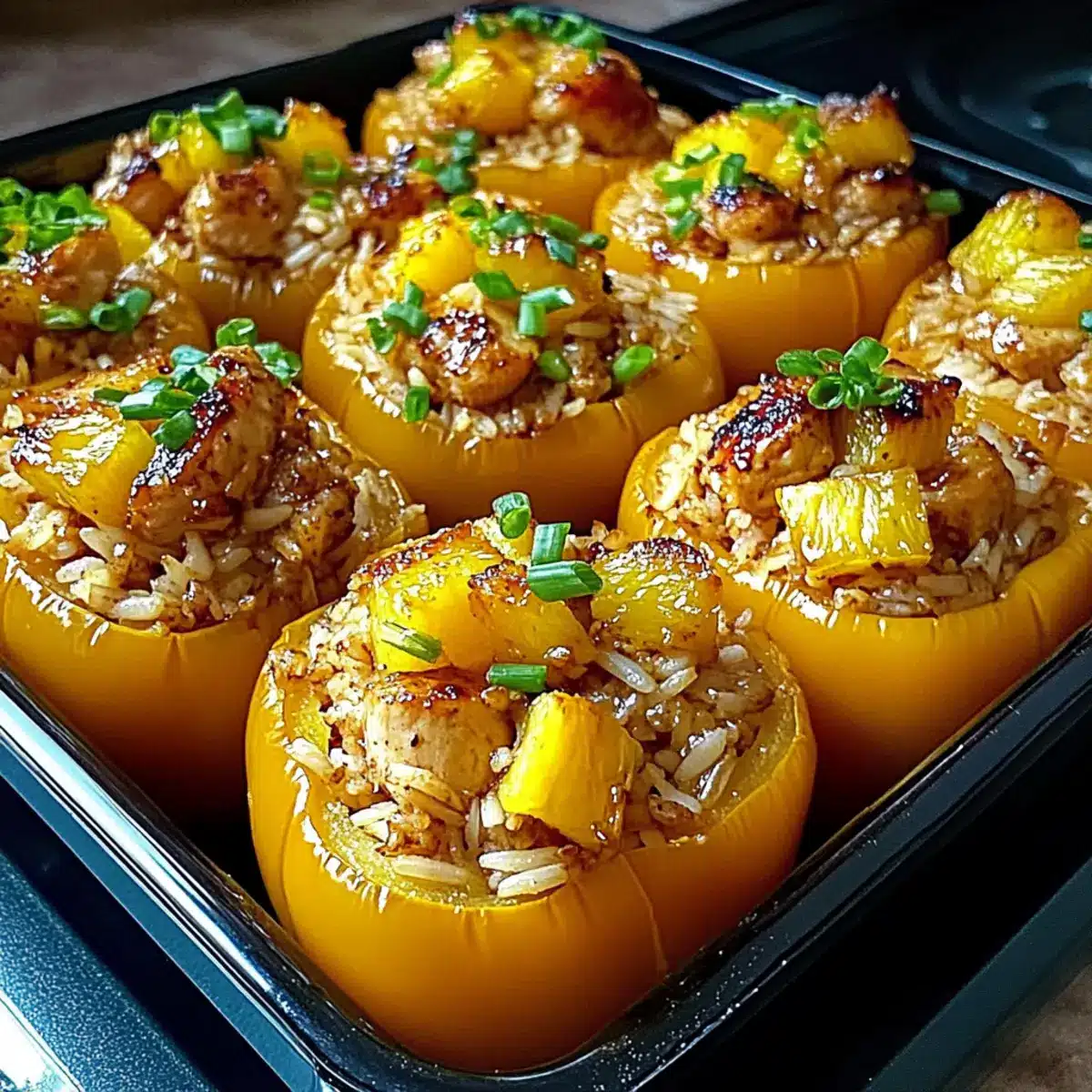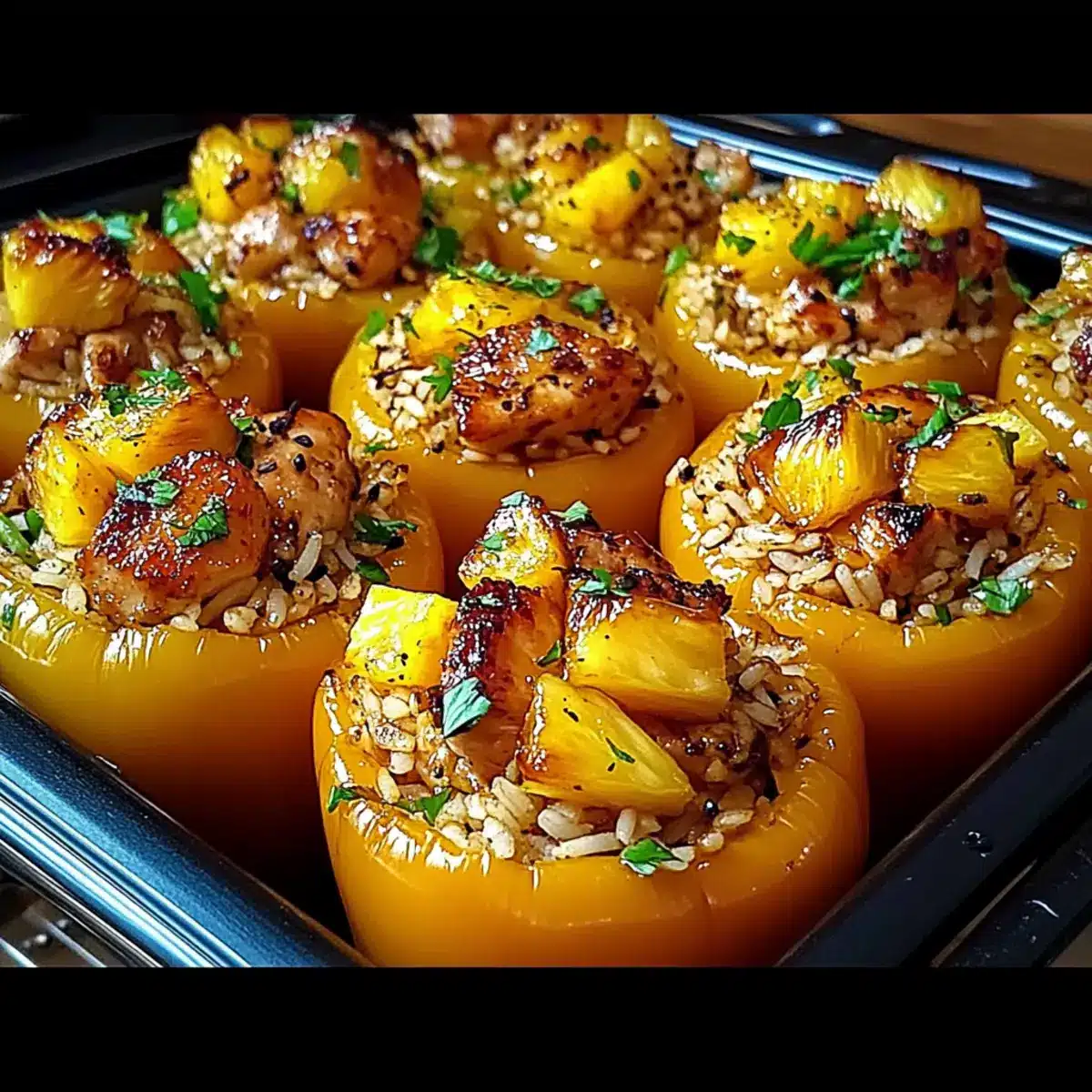 Once baked, remove the stuffed peppers from the oven and let them cool for a few minutes. This cooling time allows the flavors to settle. When ready to serve, consider garnishing with extra pineapple pieces or sliced green onions for a fresh touch that complements the sweet and savory flavors beautifully.