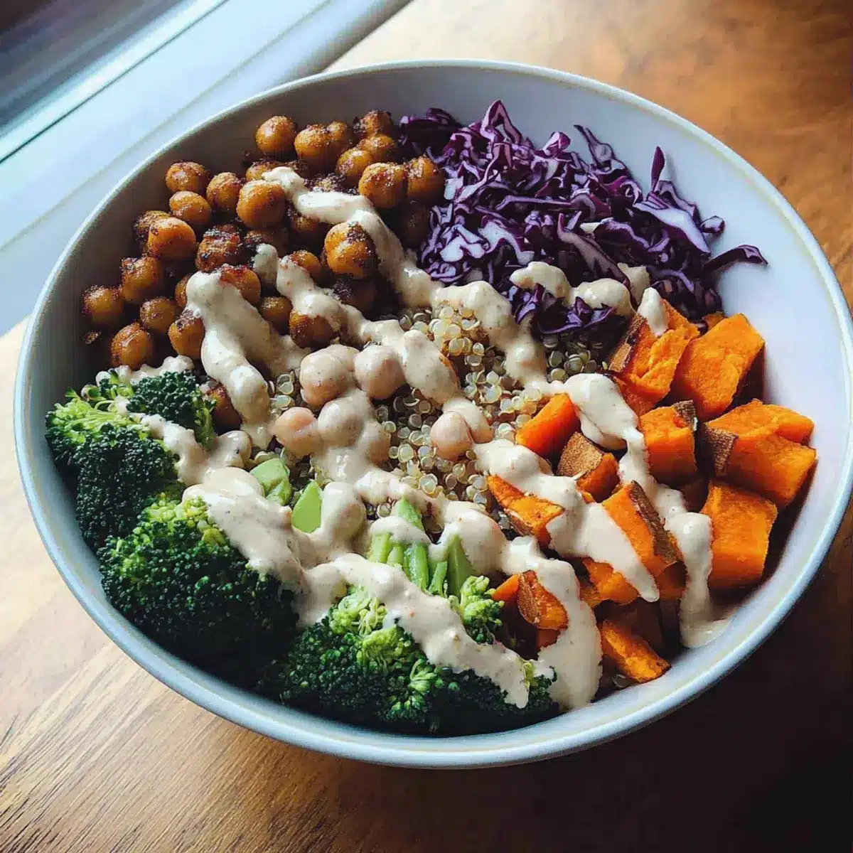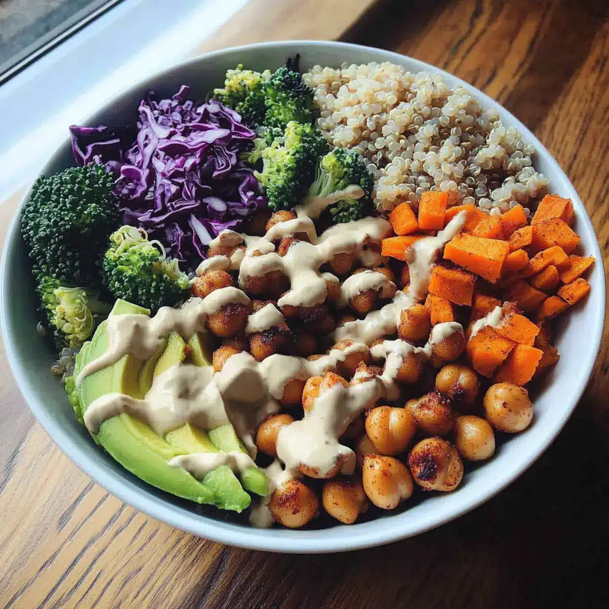 Start by placing a generous serving of quinoa at the bottom of your bowl. Layer in the chickpeas, steamed broccoli, roasted sweet potato, shredded carrots, red cabbage, and sliced avocado in sections on top of the quinoa. This arrangement not only enhances the visual appeal of your Vegan Buddha Bowl but also ensures a delightful mix of colors and textures with every bite.