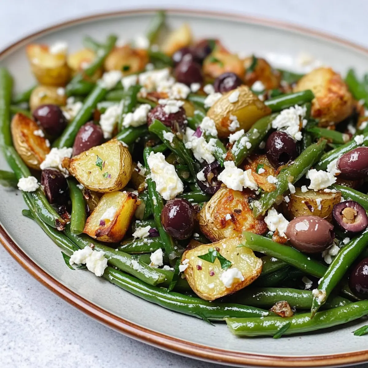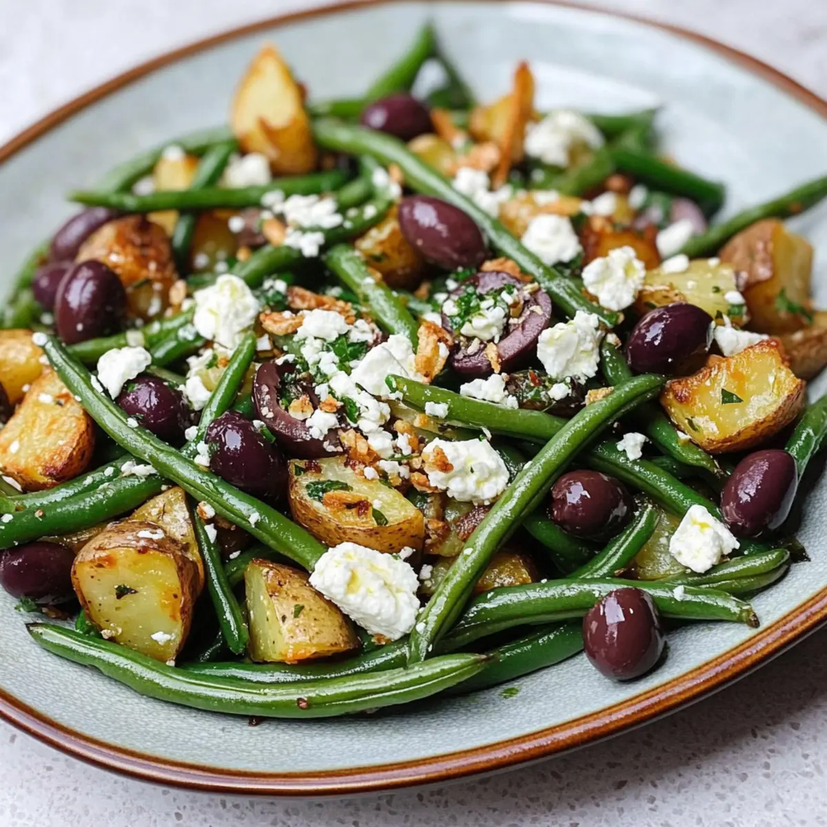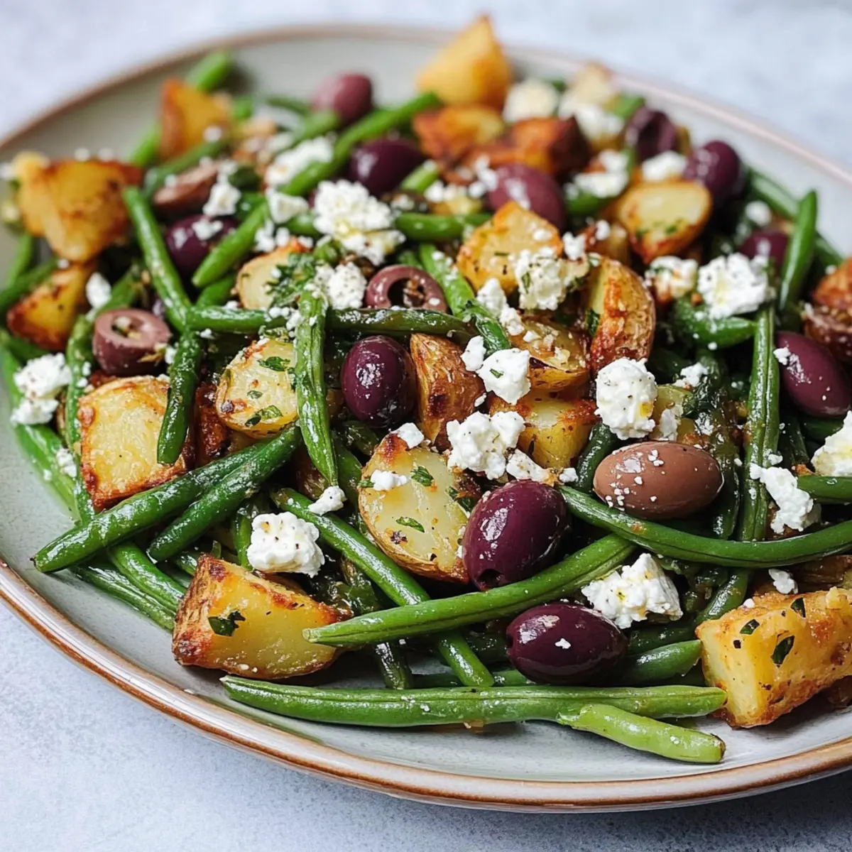 - On a platter, layer blanched green beans, crispy potatoes, red onion, Kalamata olives, and feta cheese. Drizzle with dressing and toss gently if desired.