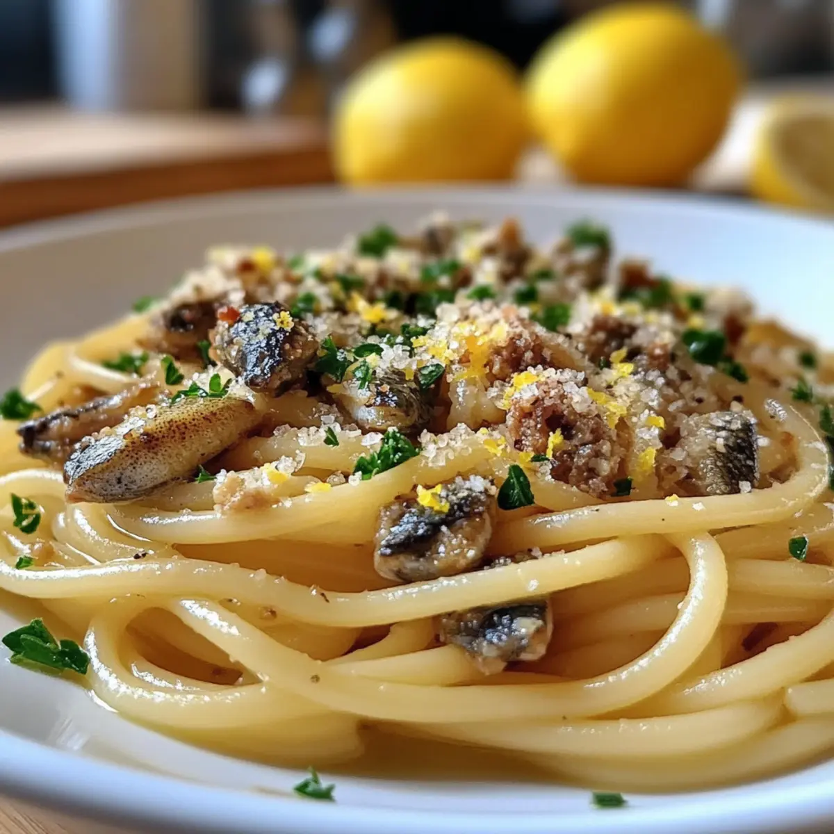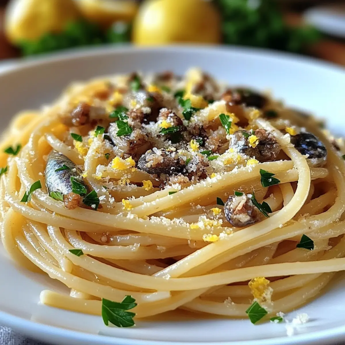 Add the drained pasta to the skillet, tossing it in the sardine mixture while incorporating the reserved pasta water. Sprinkle in the zest of 1 lemon and juice from 1/2 lemon, along with 2 tablespoons of chopped fresh parsley. Stir everything together for 1–2 minutes until the pasta is evenly coated and glossy, ensuring the flavors are beautifully integrated.